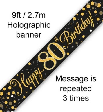 9ft Banner Sparkling Fizz 80th Birthday Black & Gold Holographic