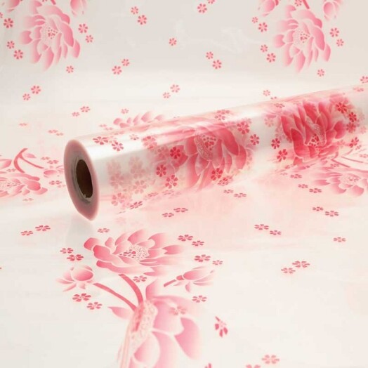 80cm x 100m clear cellophane with red lizzie flowers on. Not just for floral arrangements, but can also be used on hampers or gift baskets.